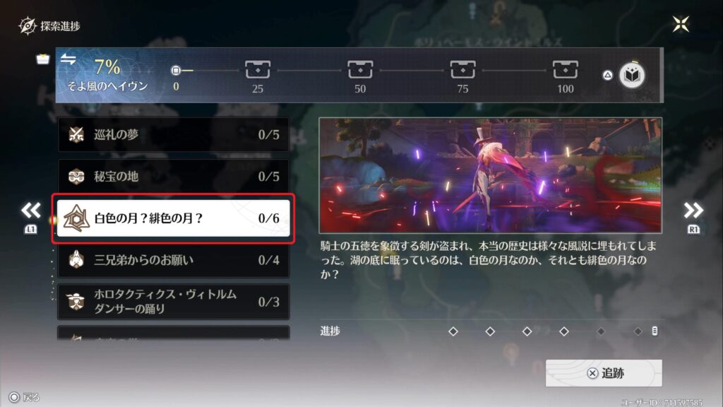 そよ風のヘイヴンのマップを開き、探索進捗で確認できる「白色の月?緋色の月?」を追跡して騎士を倒していきます。