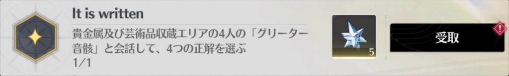 貴金属及び芸術品収蔵エリアの4人の「グリーター音骸」と会話して、4つの正解を選ぶ