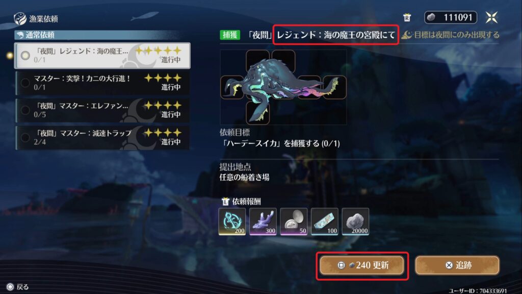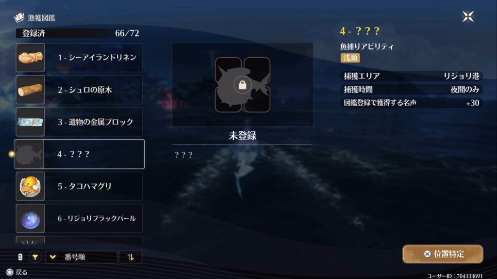 フィッシュキング(レジェンド)の魚は図鑑から位置特定ができないため、任務で出現するまで更新をしていくと分かりやすいです。
