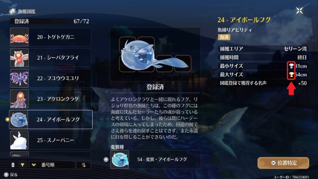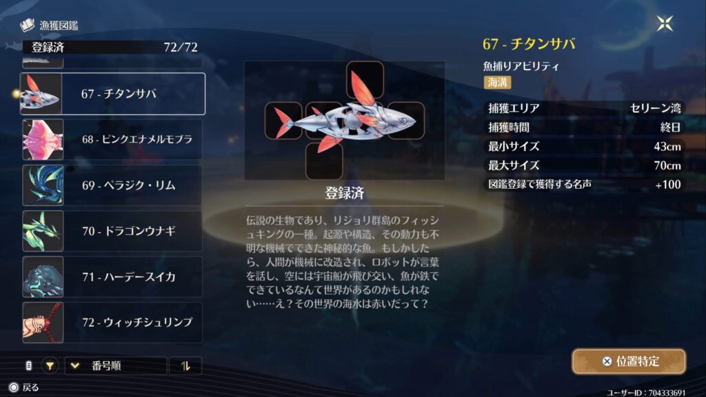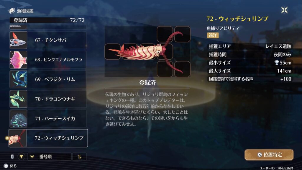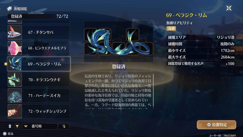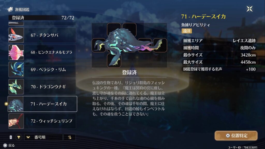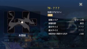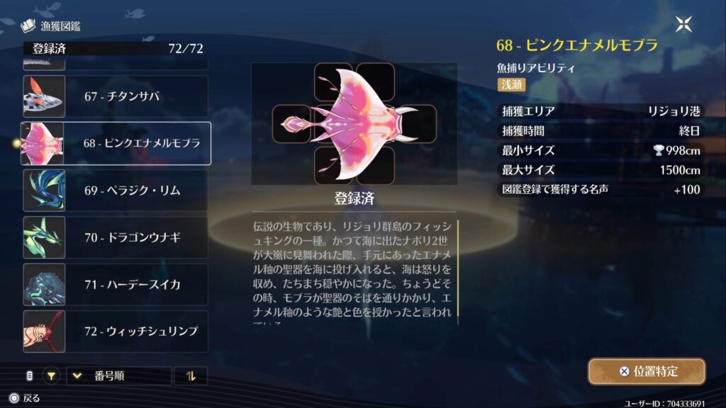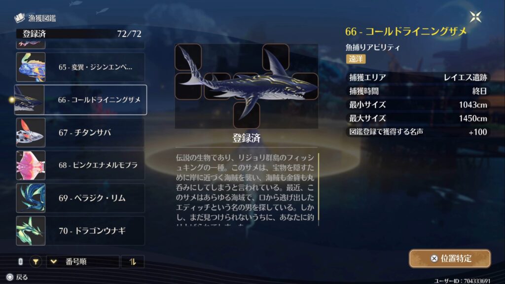 No.66~No.72のフィッシュキングは釣りスポットのリスポーンがおよそ6時間程かかるため、フィッシュキングを釣ることを優先しながら、他の魚も狙いに行くと効率が良いです。