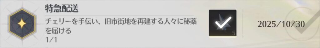 チェリーに話しかけると逸話任務「チェリーの薬送りに手伝う」が発生、任務を進行すると実績獲得です。