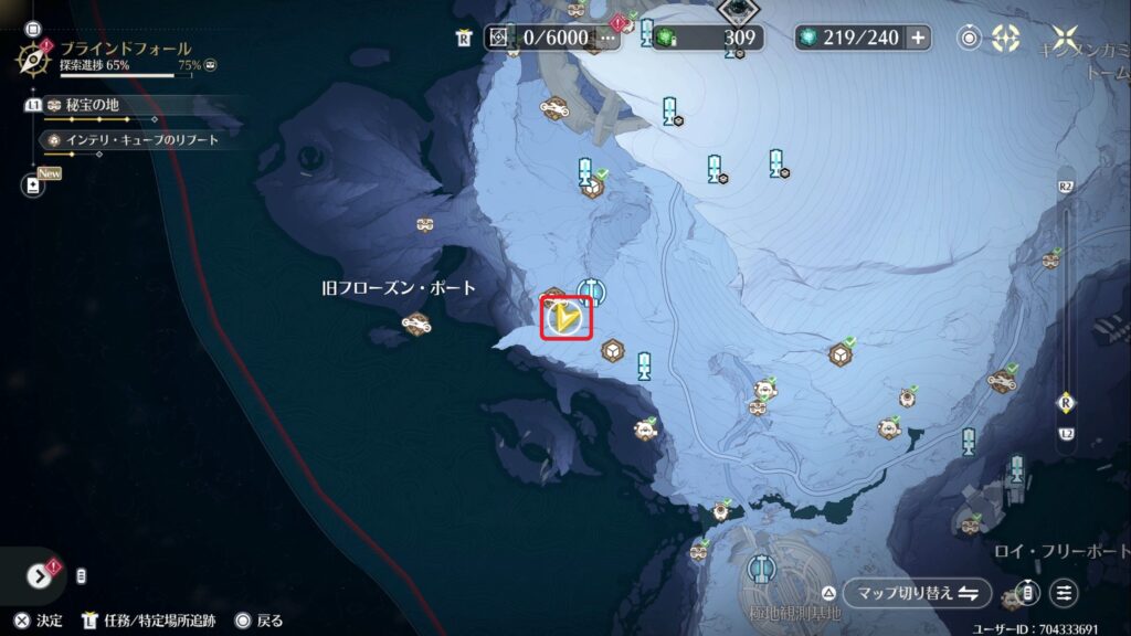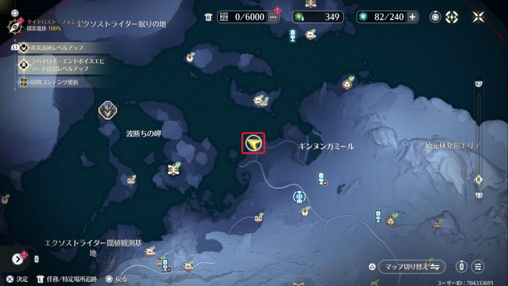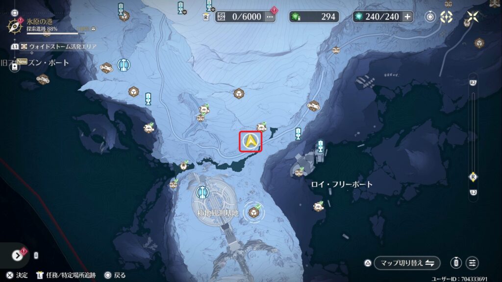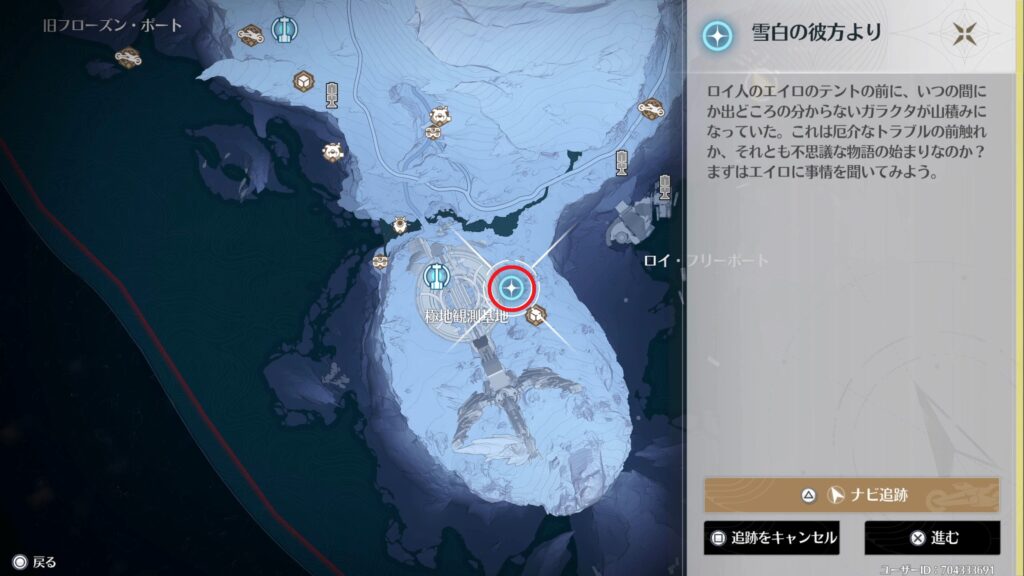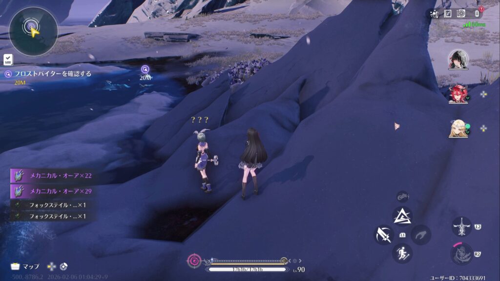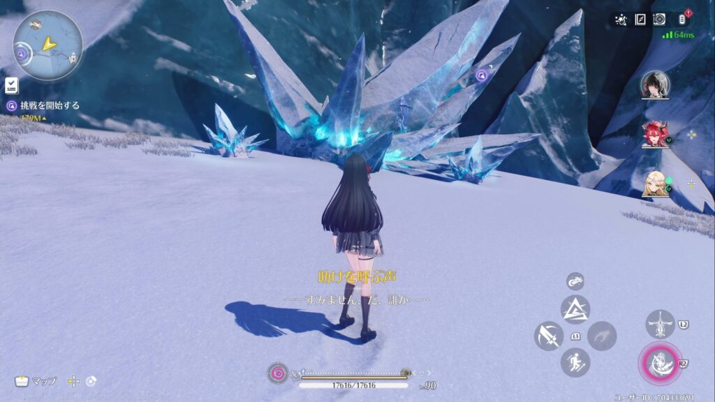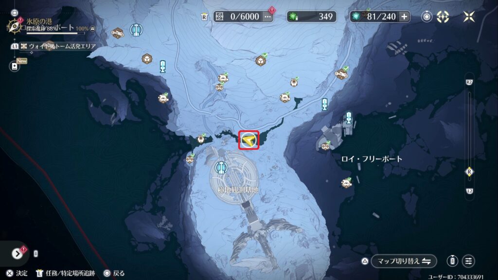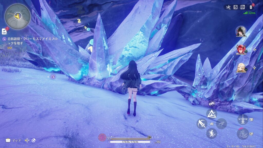 下図の場所に向かい、氷に近づくと助けを呼ぶ声が聞こえるので、音骸顕現でグローモスを使い、氷を壊します。