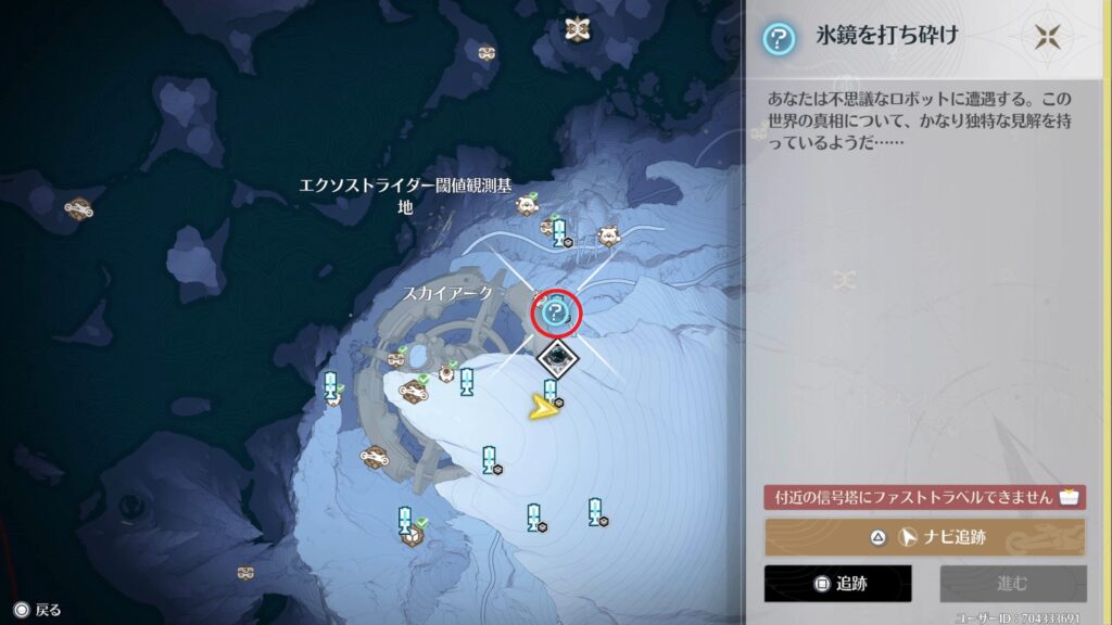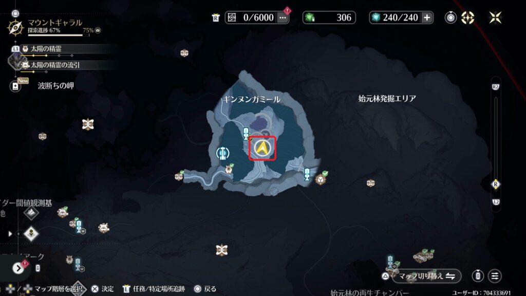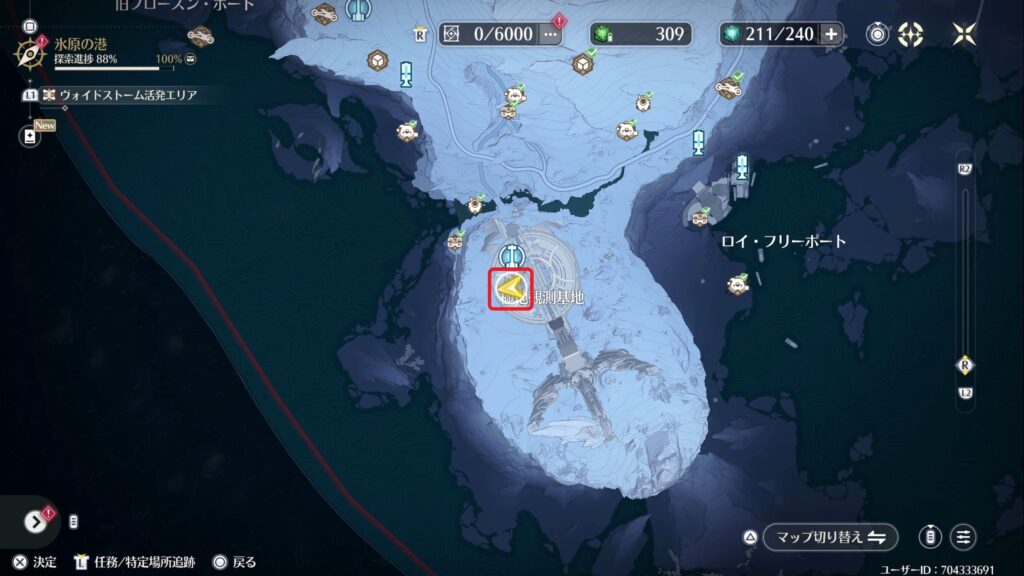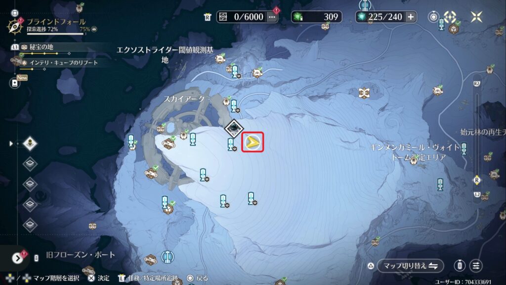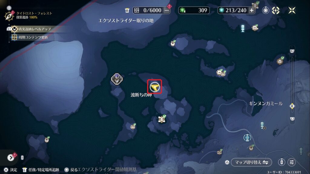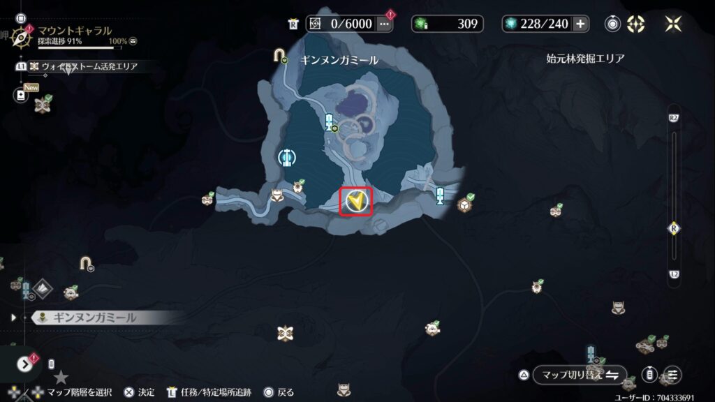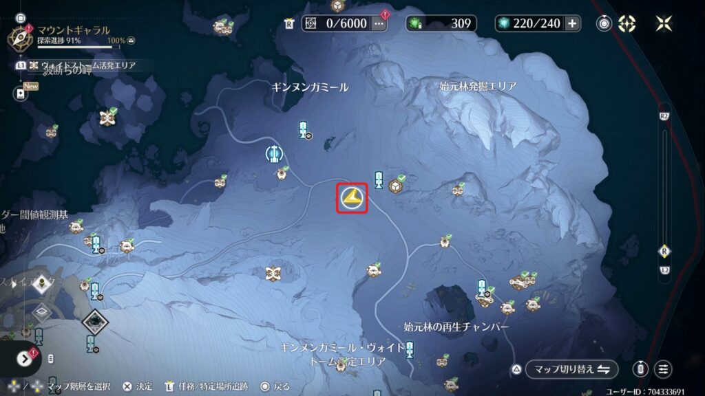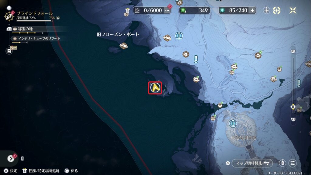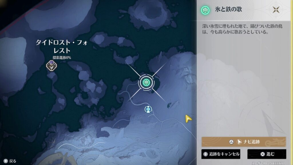 下図の場所に向かい、氷に近づくと助けを呼ぶ声が聞こえるので、音骸顕現でグローモスを使い、氷を壊します。