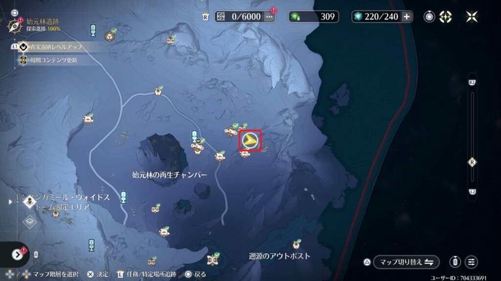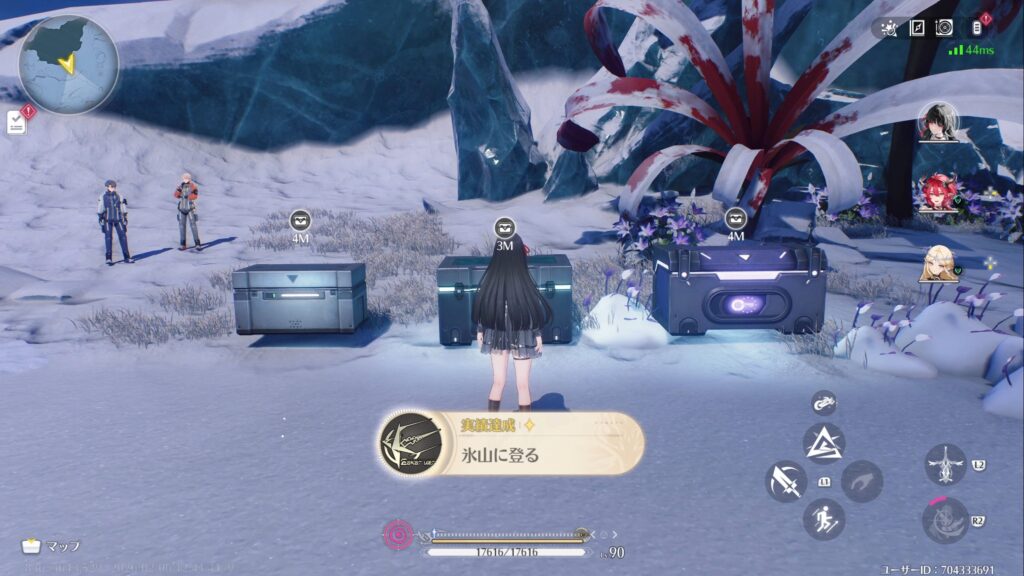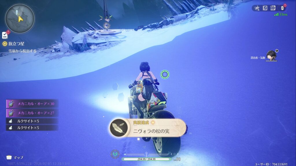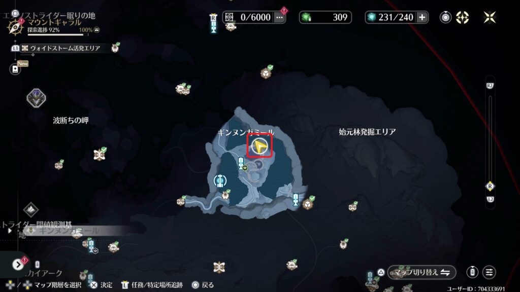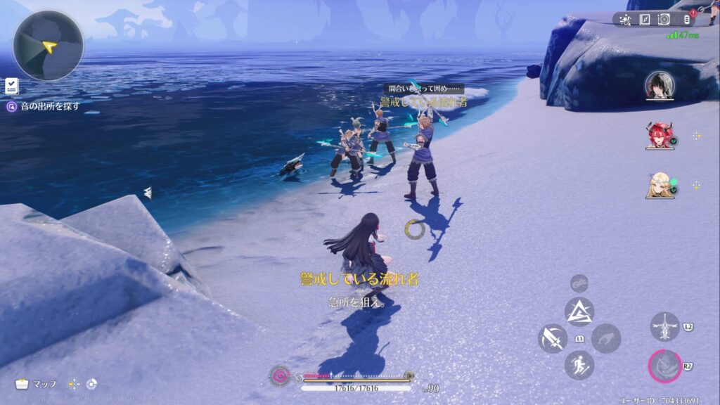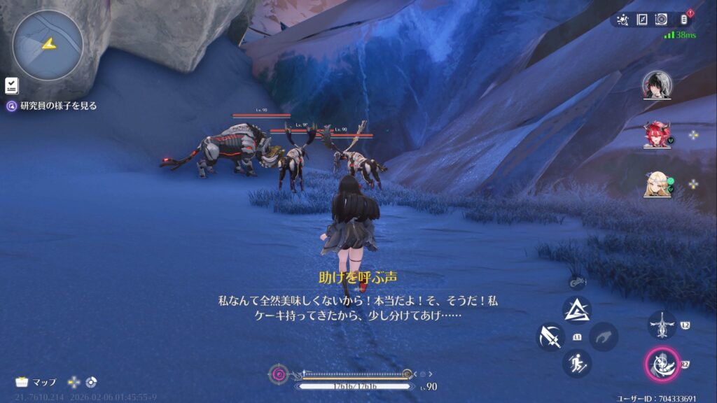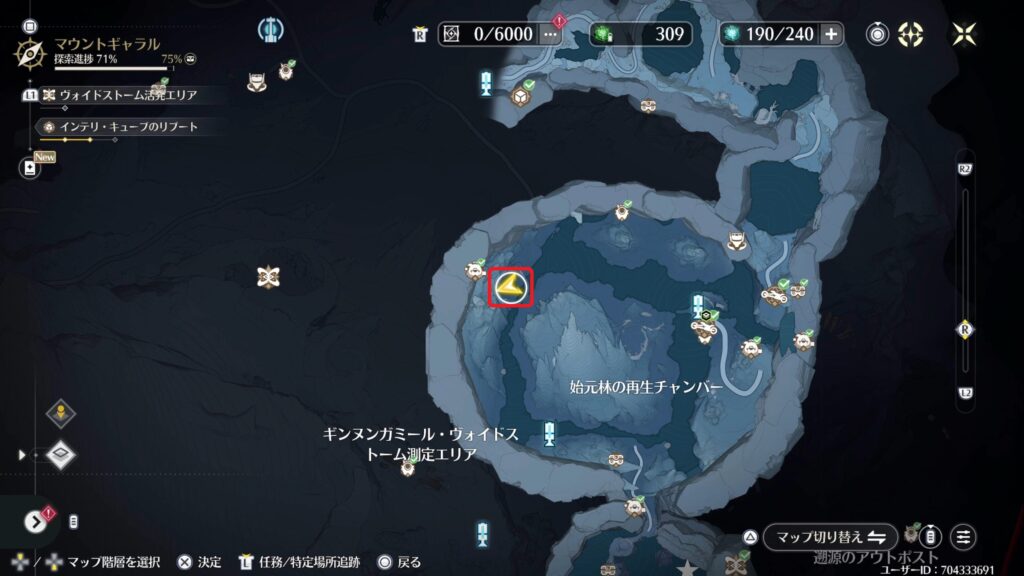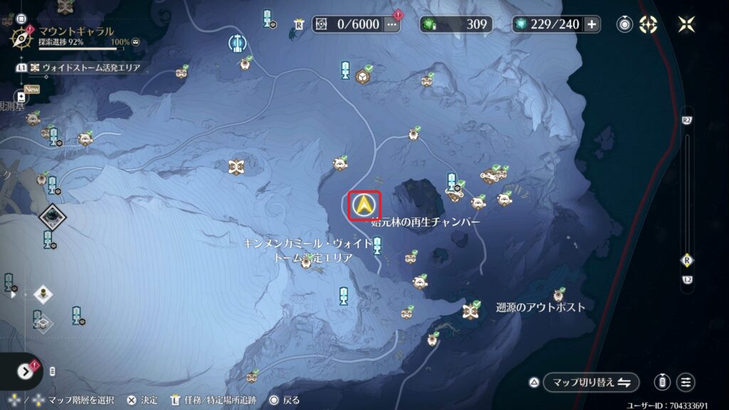 下図の場所に向かい、氷に近づくと助けを呼ぶ声が聞こえるので、音骸顕現でグローモスを使い、氷を壊します。