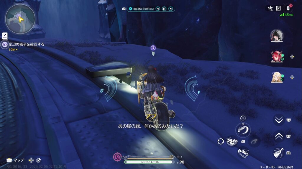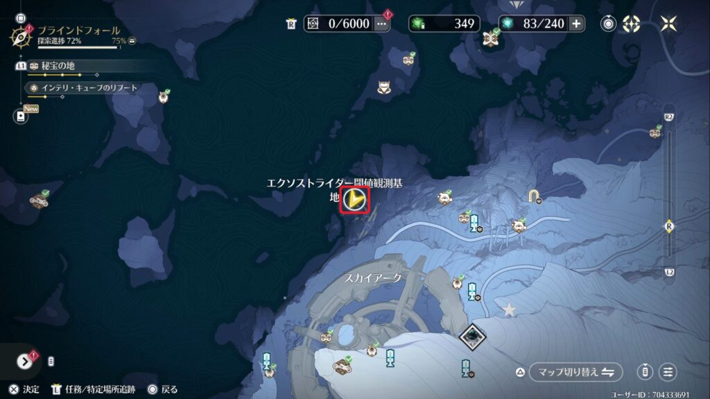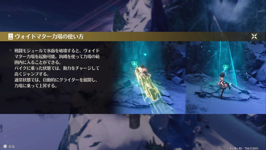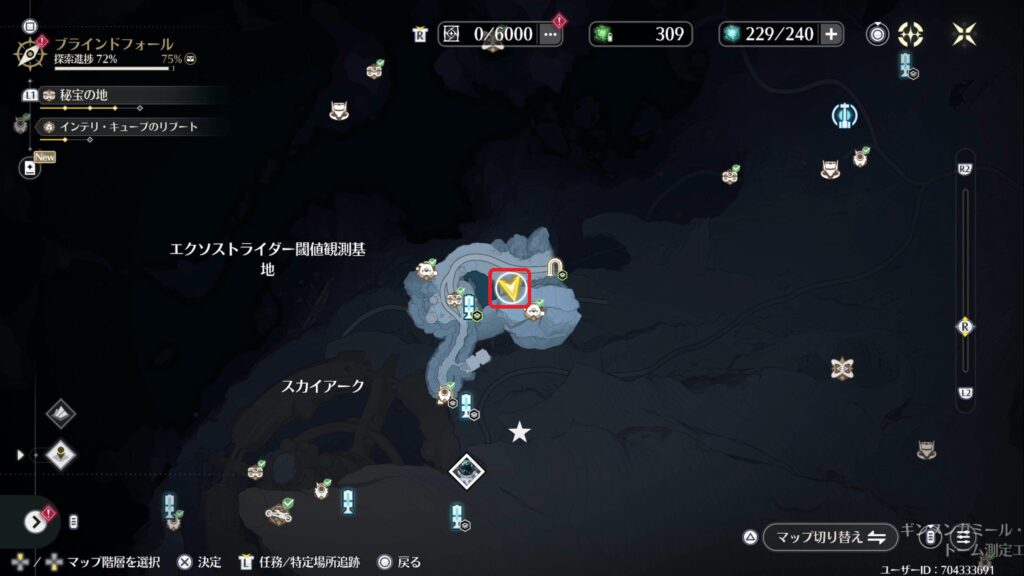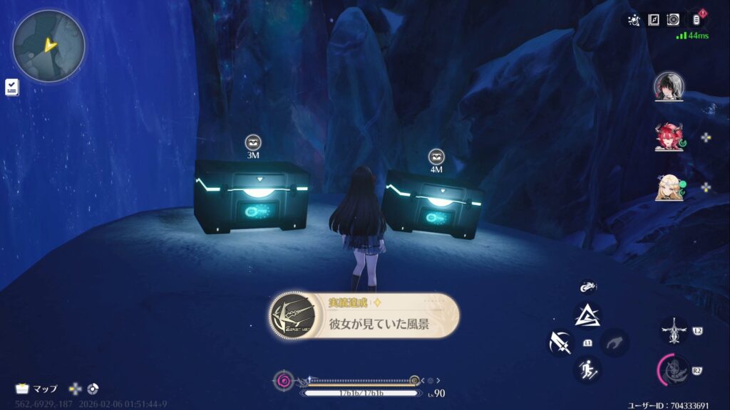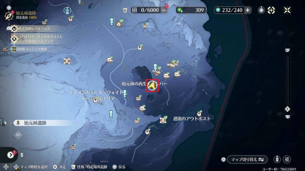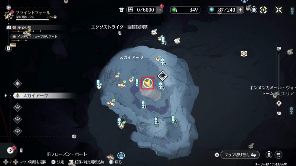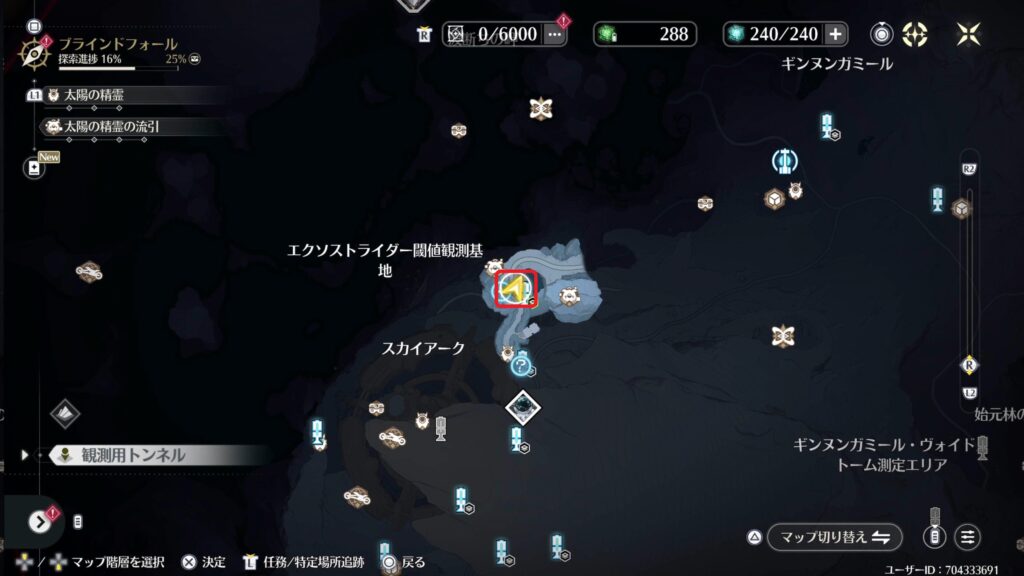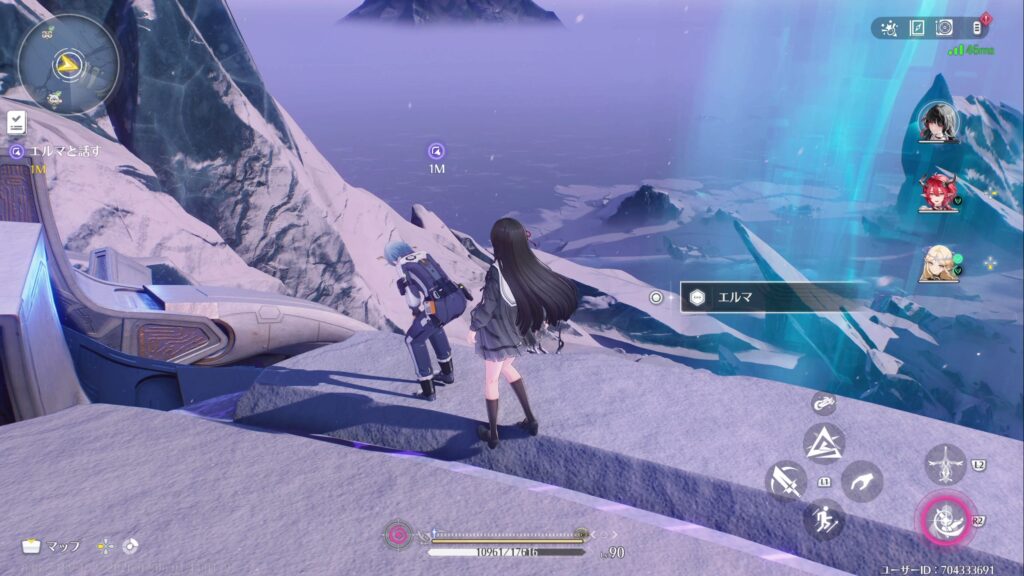 下図の場所に向かい、氷に近づくと助けを呼ぶ声が聞こえるので、音骸顕現でグローモスを使い、氷を壊します。