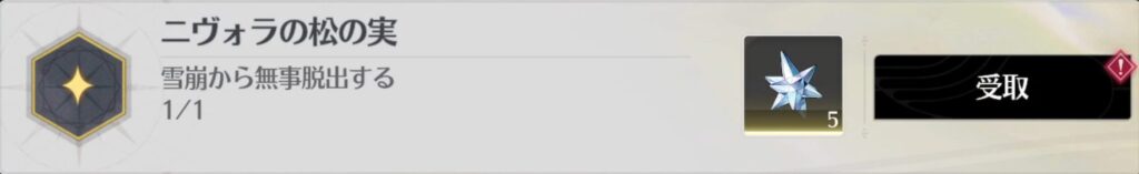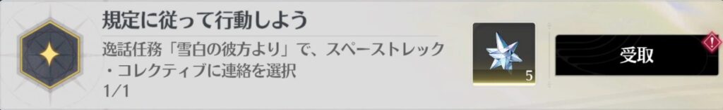 逸話任務「雪白の彼方より」を進行し、任務中の選択肢によって実績が変わります。