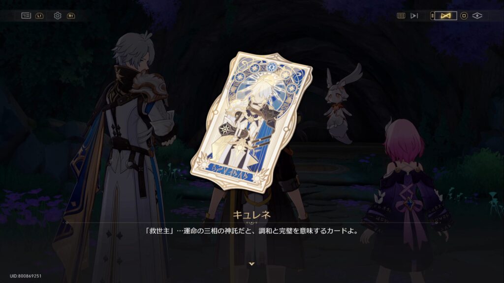 キュレネが神託カードで未来を再度占うと、ファイノンは「救世主」のカードを引いた。