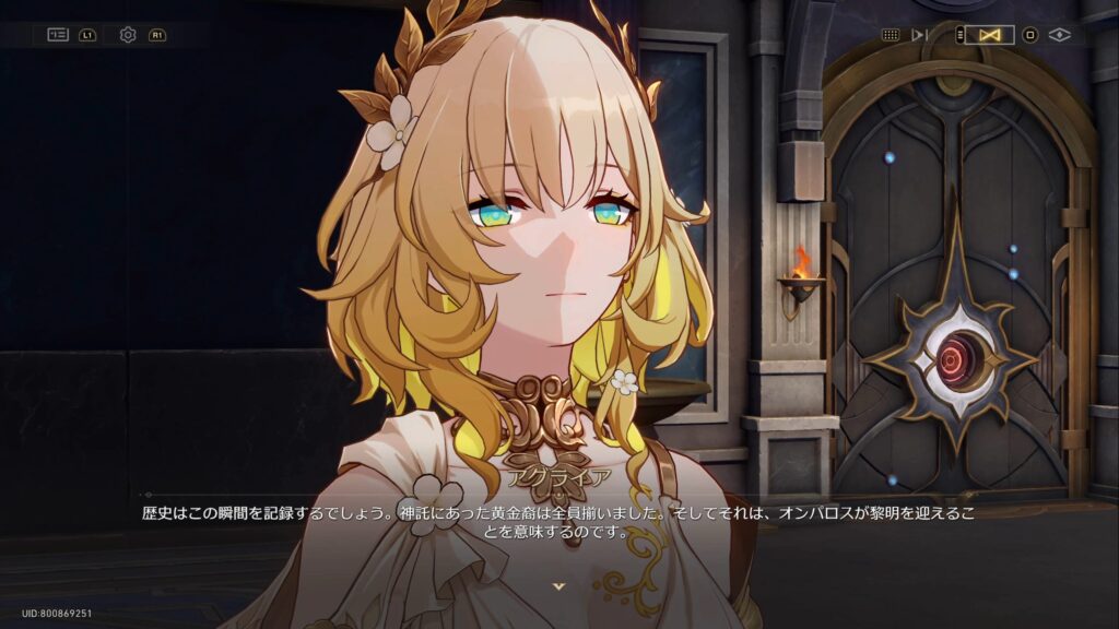 死者を出すことなくモーディスを火を追う旅に引き入れ、アグライアはこれで黄金裔が全員揃ったとした。