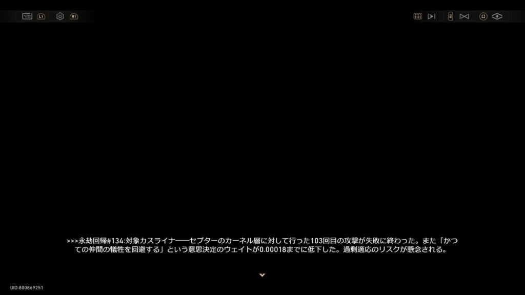 永劫回帰を重ねる中で、カスライナの「かつての仲間の犠牲を回避する」という意思決定の比重は下がり続け、メンタル関数は一部が破損し、もはや修復不可能な状態に陥っていた。
