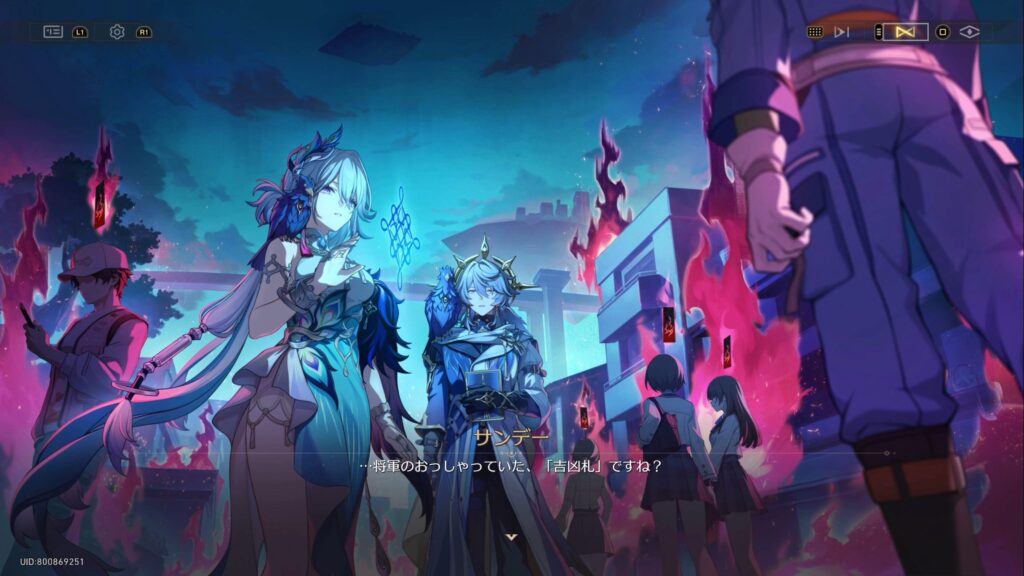 サンデーが調律の力を使い、爻光の目に映っている視界を見ると、楽園の町の人全員に「凶札」が浮かんでいた。