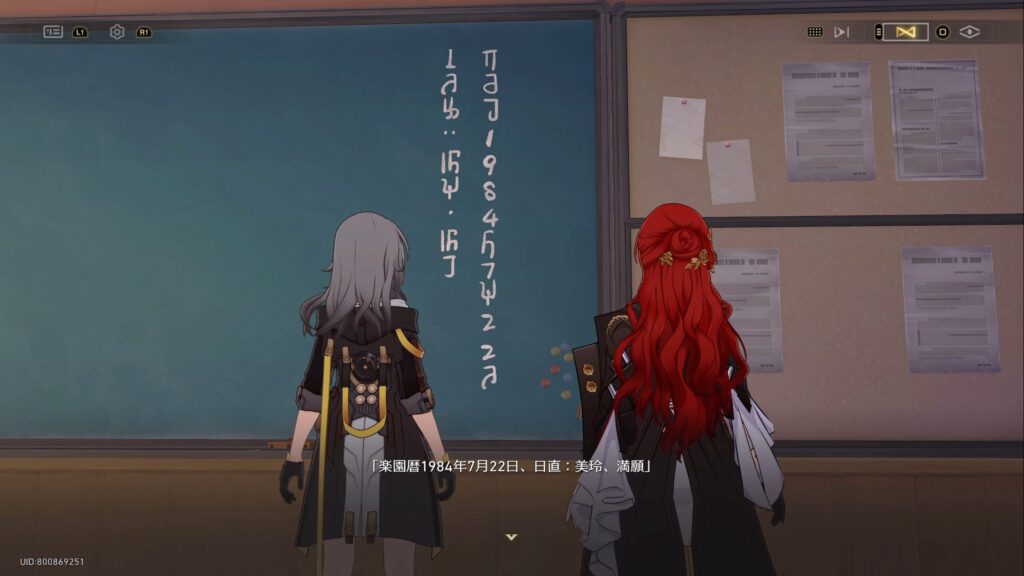 教室の黒板には「楽園歴1984年7月22日、日直:美玲、満願」と書かれている。