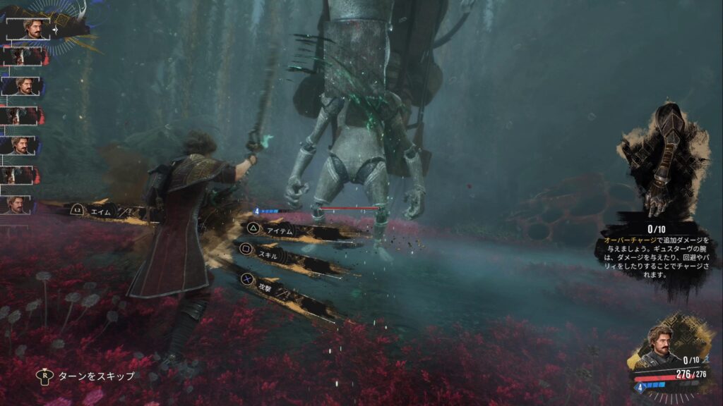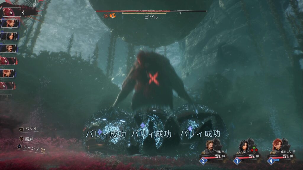 基本はコマンド式の戦闘ですが、敵の攻撃に対してパリィ・回避・ジャンプといったアクション操作も求められるハイブリッド型のバトルが特徴です。
