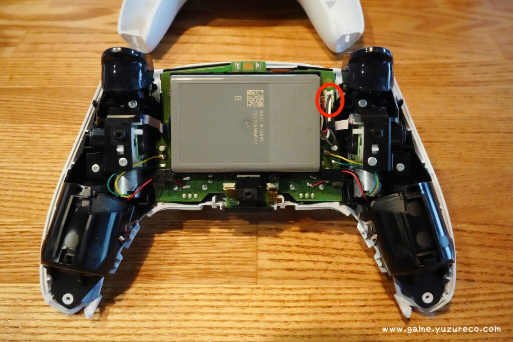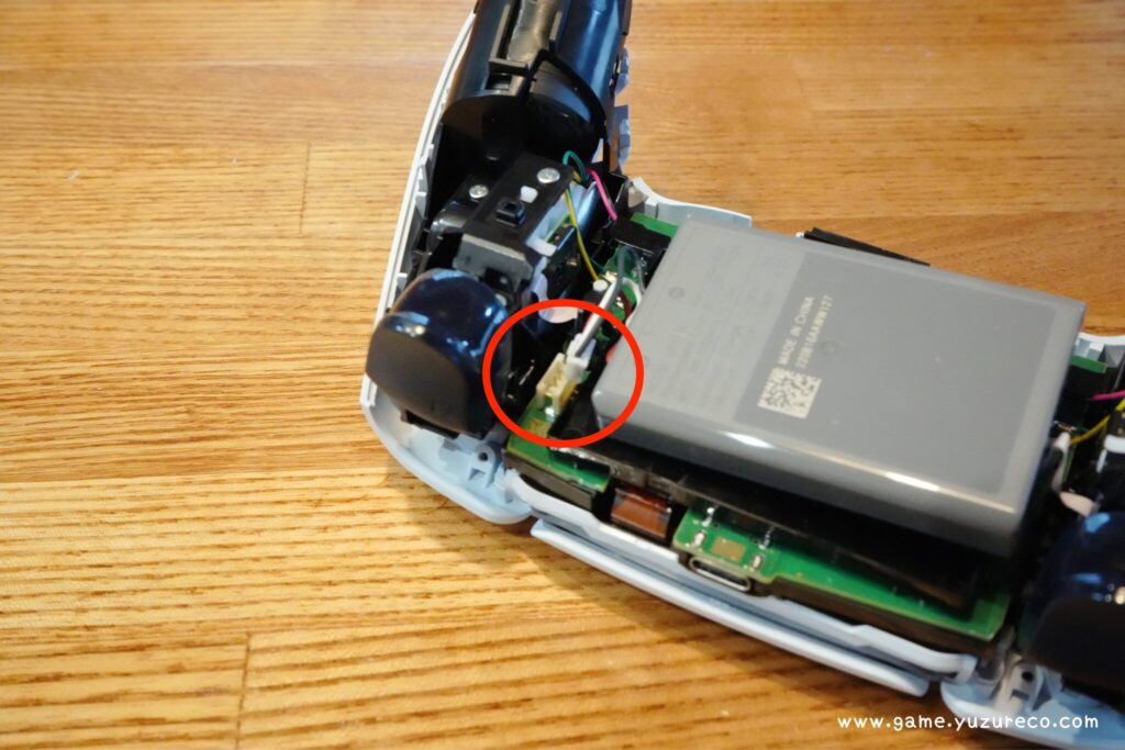 次は真ん中のグレーのバッテリーを外すために、下図の白い部分にはまっている部品を取ります。(ケーブルを断線しないように気をつけます)