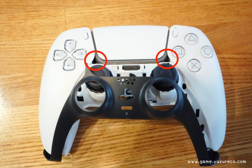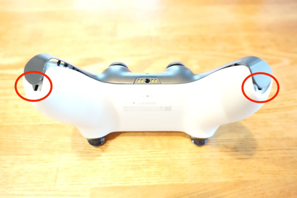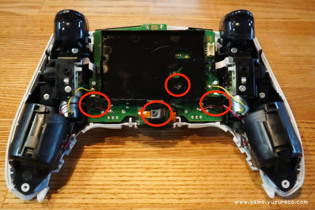 持ち手部分とL1・R1ボタンがあった場所にネジが4箇所とめられているので、プラスドライバーで外していきます。