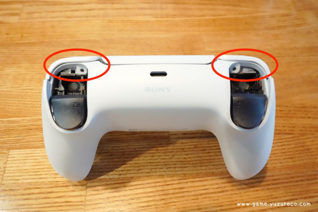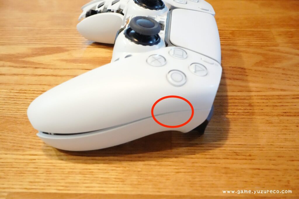 まずはL1ボタンとL2ボタンの間にマイナスドライバーをさしこみ、L1ボタンの方へぐっと押し上げて外します。