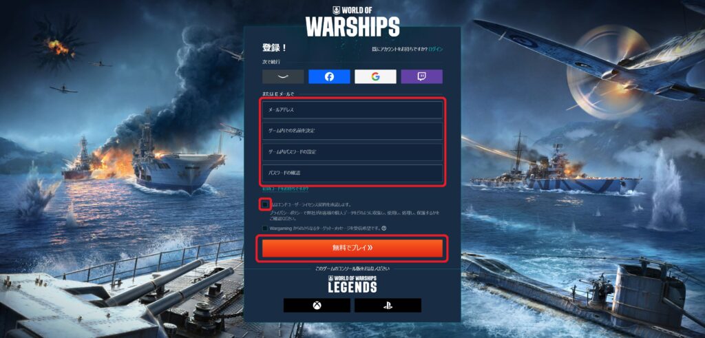 新規登録する場合は、メールアドレス・ゲーム内での名前・パスワードを入力して登録します。